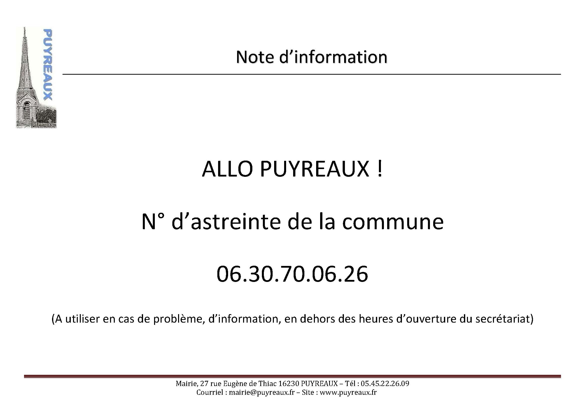 - Nous sommes à nouveau en confinement, la mairie qui reste ouverte et sera à vos côté pour cette période compliquée. En cas de problème, n’hésitez pas à prendre contact avec nous par téléphone: 05.45.22.26.09 ( répondeur consulté tous les jours pendant cette période ) par mail : mairie.puyreaux@orange.fr . Nous reviendrons vers vous, via le site internet, pour différentes informations.